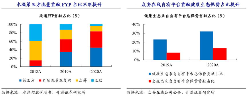 經(jīng)典案例:根據(jù)水滴招股說明書、眾安在線公司公告、開源證券研究所等綜合資訊表明,水滴最初通過自營水滴籌、水滴互助引流至其水滴保平臺,水滴籌裂變式宣傳效果驚人,其已吸引超 3.4 億人捐款,并于近年加強第三方渠道流量建設(shè),其貢獻 FYP 占比自 2018 年的 1.9%提升 43pct 至 2020 年的 44.9%。眾安在線則于起步之初將自身保險產(chǎn)品嵌入互聯(lián)網(wǎng)場景中,累計為超 5.24 億名客戶提供保障,且眾安在線通過品牌營銷、建設(shè)自營平臺,嘗試將自身打造為流量入口,其自營平臺健康生態(tài)保費收入占比 2020 為 32%,較 2019 年提升 9pct。