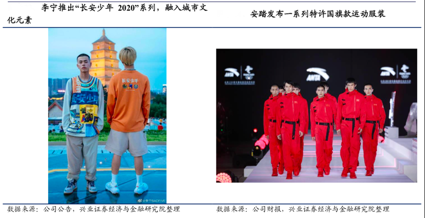 經典案例:根據公司公告、公司財報、興業證券經濟與金融研究院等綜合資訊表明,“中國李寧”中的產品系列名直接取材自中國傳統文化,如旗下的跑鞋就已采用了四大名駒其三的名字——“飛電、赤兔、絕影”,構建與文化的直接聯 系。同時李寧構建城市 IP 系列,深入中國本土挖掘城市特色,踐行城市文化的傳播。安踏成功獲得獨家特許權,成為第一家能夠銷售帶有“國旗”產品的品牌,與 “中國品牌”的標簽深度綁定。