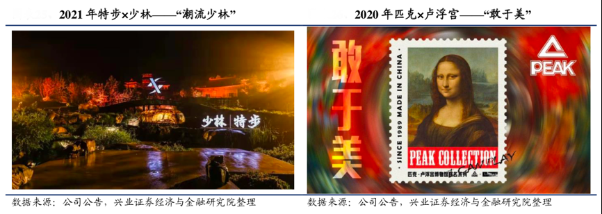 經典案例:根據公司公告、興業證券經濟與金融研究院等綜合資訊表明,特步深挖少林文化內涵,是首個與少林聯名的品牌,在少林寺門前上演了 “開門見山”的國潮秀,此后開始陸續推出聯名系列;2021年 5 月 15 日,特步正式宣布將“特步少林”系列納入全新廠牌旗下,逐步完成與少林文化的深度合作。