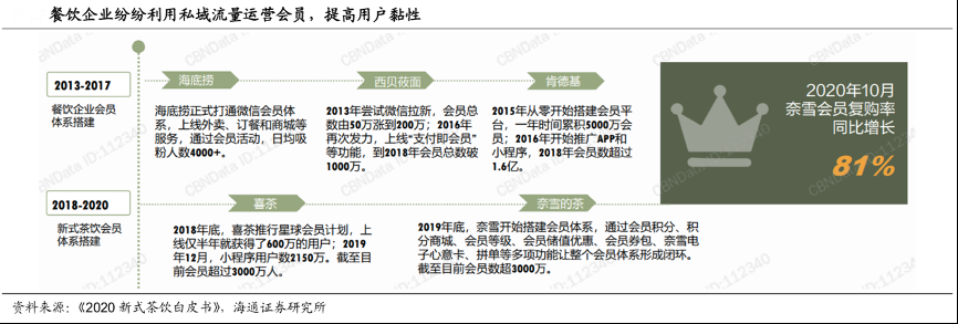 經典案例:根據《2020新式茶飲白皮書》、海通證券研究所等綜合資訊表明,越來越多的新式茶飲企業、餐飲企業通過小程序、APP、天貓、微商城、社群、官方媒體矩陣等流量入口構建品牌流量池,打造高效的線上營銷工具,提供更多功能如預點單、積分換禮品、專屬評價渠道,更好匯聚消費者數據及意見。