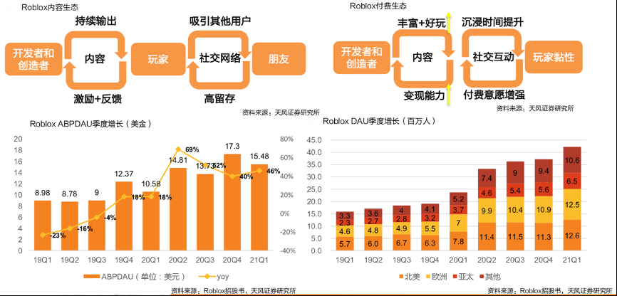 經典案例:根據Roblox招股書、天風證券研究所等綜合資訊表明,Roblox的UGC內容生態+社交屬性構筑正向飛輪效應:越多開發者創造游戲+玩法內容,玩家沉浸時間越長,通過社交網絡吸引越 多新用戶;玩家基礎擴張的同時,由于UGC的激勵+反饋經濟系統,越多玩家變成開發者,形成正向飛輪效應。