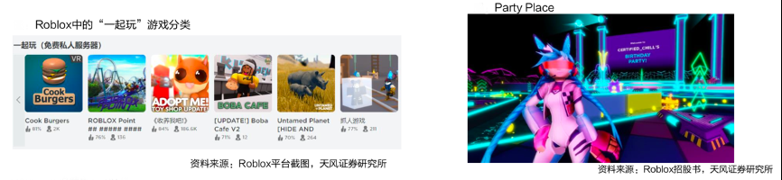 經典案例:根據Roblox平臺、Roblox招股書、天風證券研究所等綜合資訊表明,不止游戲,Roblox更是個青少年社交、虛擬生活平臺:玩家能夠在其中聊天,與現實或虛擬的朋友進行互動;疫情期間還推出了“一起玩”游戲分類,鼓勵玩家進行線上游戲的同時社交;推出的“party place”功能可供玩家在虛擬世界中舉辦生日派對和其他聚會,舉辦虛擬演唱會等。