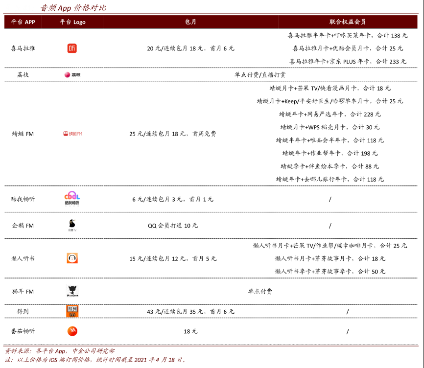經典案例:根據各平臺APP、中金公司研究部等綜合資訊表明,主流的綜合音頻平臺會員連續包月價格在 3~35 元間(首月價格主要為 5~6 元),與長視頻平臺、漫畫平臺、在線教育平臺等聯合會員權益較多,聯合會員包月價格在 15~25 元間。其中, 喜馬拉雅/蜻蜓 FM/番茄暢聽的連續包月價格均為 18 元,較長視頻平臺,如騰訊視頻/愛奇藝/優酷/芒果 TV 連續包月價格 15~19 元相近。
