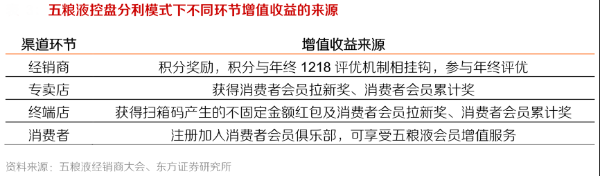 經典案例:根據五糧液經銷商大會、東方證券研究所等綜合資訊表明,五糧液的控盤分利模式下,經銷商、專賣店、終端店以及消費者等各個環節均有相對應的增值收益來源,包括積分獎勵、會員拉新獎、會員增值服務等。為配合控盤分利模式的引進,五糧液 19 年 加大渠道扁平化力度,將 7 大營銷中心改為 21 個營銷戰區,下設 60 個營銷基地,構建深耕區域市場、快速響應市場的模式,并補充大量銷售人員,加強控盤分利模式的落地。