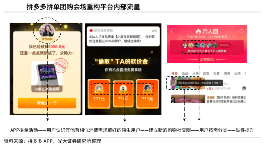 經(jīng)典案例:根據(jù)拼多多APP、光大證券研究所等綜合資訊表明,拼多多通過拼單團購會場重構(gòu)平臺內(nèi)部流量,將原有用戶流量按需再分類,通過拼單、萬人團等活動引導用戶在購物時社交,從而形成具有相似購物需求和偏好的社交圈。拼多多用戶流量池在一定程度上自發(fā)按需分類,為拼多多的 C2M 體系打造奠定底層基礎(chǔ)。