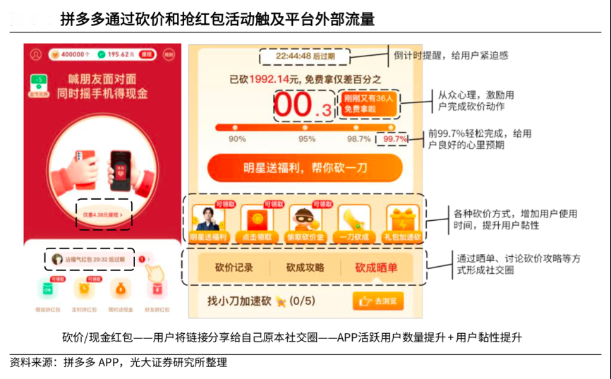 經(jīng)典案例:根據(jù)拼多多APP、光大證券研究所等綜合資訊表明,拼多多通過砍價和搶紅包活動觸達用戶社交圈流量,引流至拼多多平臺內(nèi)。其通過推出朋友砍價和搶現(xiàn)金紅包等活動,引導用戶將鏈接發(fā)給朋友,獲得更多新用戶。拼多多的砍價和搶紅包的首次參與難度很低,“砍第一刀”便可以獲得大部分折價,用戶形成良好的心里預(yù)期,將繼續(xù)參與砍價。