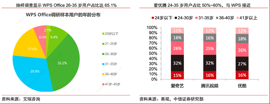 經典案例:根據艾瑞咨詢、易觀、中信證券研究部等綜合資訊表明,結合2018 年艾瑞咨詢針對 2065 名 WPS Office 用戶做的抽樣調查顯示,WPS Office 用戶群中 26-35 歲用戶占比達 65.1%。這一年齡段屬于社會核心勞動人群,處在收入上升期,兼具提升工作效率的需求與消費能力,89 元/年的 WPS 會員以及 179 元/年的超級會員對這部分用戶構成的消費壓力相對有限。
