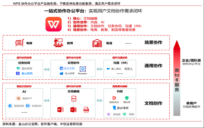 經典案例:根據金山辦公官網、軟件客戶端、中信證券研究部等綜合資訊表明,金山辦公公司于 2020 年 12 月CHAO 辦公大會宣布將“協(xié)作”加入此前“多屏、云、內容、 AI”形成新五大戰(zhàn)略,表示未來將投入 1/3 以上研發(fā)力量在“協(xié)作”領域,并通過協(xié)作戰(zhàn) 略發(fā)力千萬級 SMB 市場。