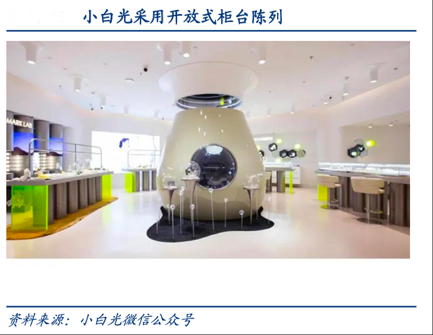 經典案例:根據小白光微信公眾號、華創證券等綜合資訊表明,小白光的線下門店開創沉浸式鉆石體驗模式,通過網絡預約進店可享受專屬接待,店內采用開放式柜臺陳列,并給顧客提供網紅化妝臺進行自由佩戴,帶給年輕消費者沉浸式體驗,同時在營銷上,對于在門店購買 1 克拉鉆石的顧客,可以贈 送天上 1 顆星星的命名權,豐富產品形式。
