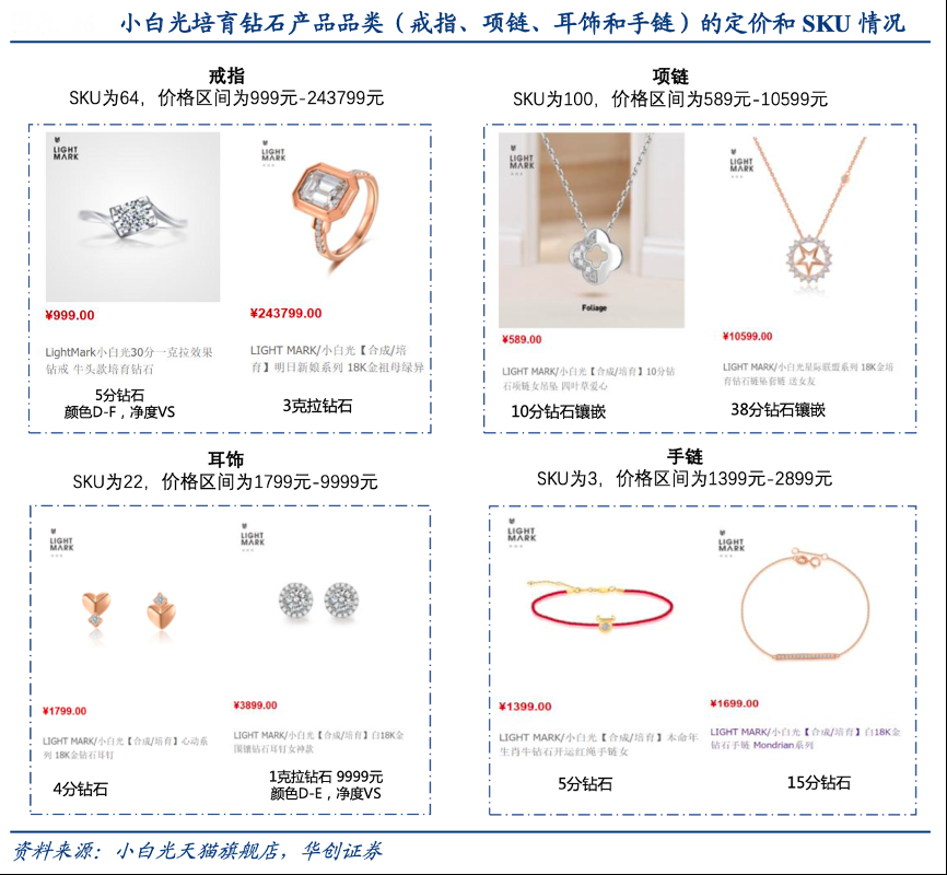 經典案例:根據小白光天貓旗艦店、華創證券等綜合資訊表明,小白光產品多元,價格定位“可負擔”,滿足不同消費場景下的消費者需求。線下門店展廳有鉆戒項鏈區(婚慶場景)和首飾區(配飾場景),線上天貓旗 艦店的界面也區分了婚戒系列、鉆戒系列和飾品系列;定價上,小白光堅持“年輕人可 負擔的奢侈”的品牌初心,對于需要購買鉆石作為禮品的消費者,可以提供 1 萬元以上 的產品,對于需要購買鉆石作為飾品的消費者,可以提供1000-3000 元的產品,滿足不同場景下的消費者需求。