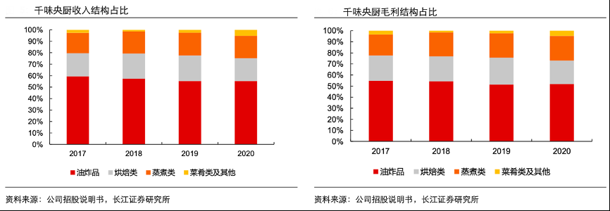 經典案例:根據公司招股說明書、長江證券研究所等綜合資訊表明,千味央廚的油炸類產品占比逐步下降,品類逐步豐富。分產品類型來看,油炸類產品是公司的主力 產品,2020年油炸品/烘焙類/蒸煮類/菜肴類及其他的收入占比分別約為 55%/20%/19%/5%,毛利率分別為 20.2%/22.9%/24.6%/19.3%,毛利占比分別約為52%/21%/22%/5%。而從 2017-2020 年各產品占比的變化來看,油炸類產品的收入占比逐步下降,千味央廚的產品品類更為豐富。