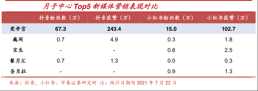 經典案例:根據抖音、小紅書、中泰證券研究所等綜合資訊表明,愛帝宮創(chuàng)新廣告營銷、明星營銷、新媒體營銷等,以抖音平臺為例,愛帝宮官方賬號分享大量科學育兒知識、新生兒和產褥期護理經驗、客戶入住體驗分享等大量原創(chuàng)視頻內容,截至 2021 年 7 月,積累粉絲數達 67.3 萬,獲點贊數累計 243.5 萬。