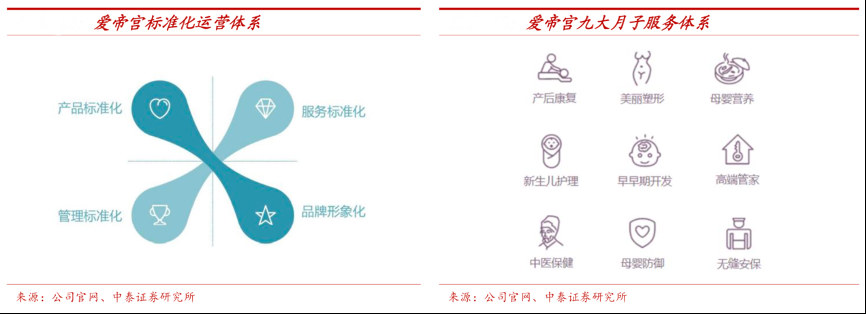 經典案例:根據公司官網、中泰證券研究所等綜合資訊表明,深圳愛帝宮深耕月子中心行業(yè)14年,建立了 9 大月子照護服務體系,涉及 1300 多項母嬰健康照護操作要點,為母嬰提供精細、專業(yè)、科學、安全的健康照護,同時其通過產品、服務、品牌、管理的標準化保證客戶獲得一致的優(yōu)越服務體驗。