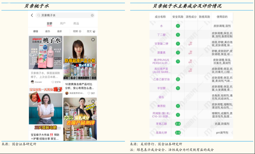 經(jīng)典案例:根據(jù)美麗修行、國金證券研究所等綜合資訊表明,貝親為日本綜合嬰童品牌,產(chǎn)品線包含嬰幼兒喂養(yǎng)用品(奶瓶、奶嘴等)、沐浴潤膚產(chǎn)品、清潔用品(衣物、奶瓶清潔劑及工具)、濕巾產(chǎn)品、孕產(chǎn)用品等。其中護膚明星產(chǎn)品為桃子水(又稱為桃葉水/桃葉精華),具有祛痱止癢、緩解紅癢等功效,為小紅書博主熱門推薦產(chǎn)品及日本代購熱門產(chǎn)品。