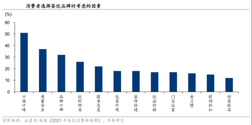 經(jīng)典案例:根據(jù)益普索聯(lián)合雀巢發(fā)布的《2021 年茶飲消費(fèi)新趨勢(shì)》、華泰研究等綜合資訊表明,有51/37%的消費(fèi)者購(gòu)買(mǎi)茶飲產(chǎn)品時(shí)將產(chǎn)口感口味/品質(zhì)及食品安全作為考慮因素。新式茶飲采用茶葉、鮮奶、鮮果等天然優(yōu)質(zhì)食材為原料,引入更多配料與風(fēng)味,整體品質(zhì)較傳統(tǒng)茶飲得到提高。