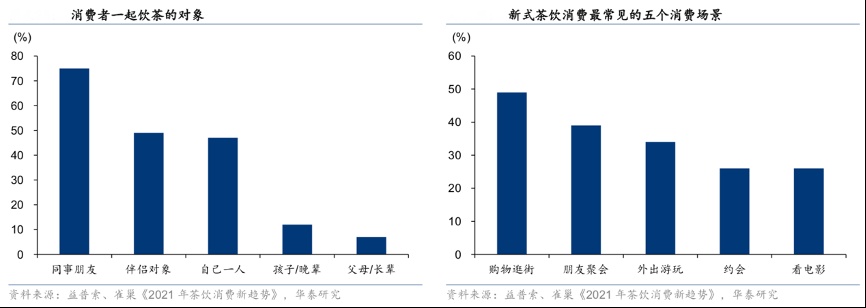 經(jīng)典案例:根據(jù)益普索聯(lián)合雀巢發(fā)布的《2021 年茶飲消費(fèi)新趨勢(shì)》、華泰研究等綜合資訊表明,茶飲帶來(lái)的豐富情感提升也是消費(fèi)者選擇新茶飲的主要?jiǎng)右颍浯尾攀遣栾嫯a(chǎn)品對(duì)功能需求的滿(mǎn)足。消費(fèi)者在喝茶飲時(shí)通常與身邊的同事、同學(xué)、朋友(75%)進(jìn)行分享,其次是與伴侶(49%)或獨(dú)處時(shí)(47%),逛街購(gòu)物、朋友聚會(huì)、外出游玩成為了最主要的茶飲消費(fèi)場(chǎng)景。