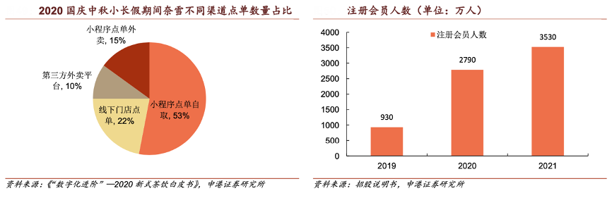 經典案例:根據《“數字化進階”—2020新式茶飲白皮書》、招股說明書、申港證券研究所等綜合資訊表明,2020年奈雪的茶上線天貓和京東自營旗艦店。截止 2021 年 8 月初,奈雪天貓旗艦店粉絲數量超過 74.7 萬。2020 年奈雪的茶首戰雙 11,一周好茶禮盒共售出超 15 萬盒,其中奈雪初露獲中國臺灣冬 茶頭等獎、茉莉初雪獲全國茉莉花茶質量金獎。2019 年和 2020 年年末,奈雪的茶分別擁有 930 萬名會員和 2790 萬名會員?;钴S會員人數由2019 年第四季度的 200 萬名增長至 2020 年第 四季度的 580 萬名。2020 年,奈雪的茶訂單總數中約 49%來自奈雪的茶會員。