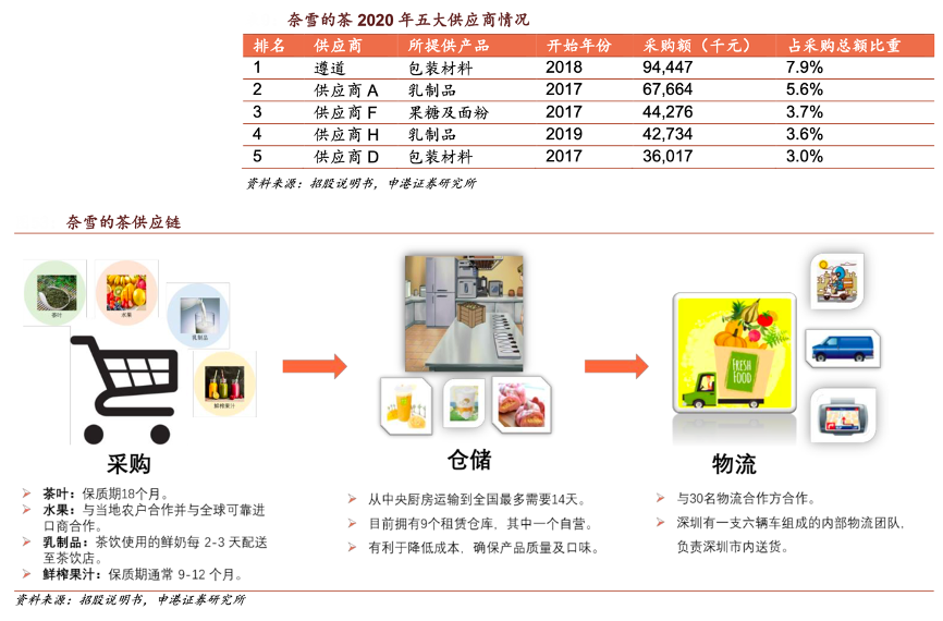 經典案例:根據、招股說明書、申港證券研究所等綜合資訊表明,2020年奈雪的茶與超過 250 家知名原材料供應商合作,其中與十大供應商的合作關系平均超過兩年。2018-2020年,奈雪的茶前五大供應商占總采購額的28%/23.8%/23.8%,其中第一大供應商為遵道,創始人趙林和彭心持股 50%。奈雪的茶根據嚴格的篩選機制對候選供應商進行預篩選,通過實地考察來確保供應商提供的產品符合質量標準。