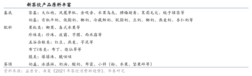 經典案例:根據益普索聯合雀巢發布的《2021年茶飲消費新趨勢》、華泰研究等綜合資訊表明,奈雪的茶新茶飲產品構成大致可分為三個層次,分別是基底(包括茶基/奶基)、配料(包括果粒類、珍珠類、五谷雜糧類、布丁/凍類、脆類)、茶頂(包括奶蓋、冰淇淋、酸奶、奶油以及各式的頂部小料如粉類、水果類、顆粒類)。基于對消費者洞察,新茶飲品牌通過對產品結構的有機組合,不斷推出新產品滿足消費者日漸多元的需求,此外消費者還可根據自身喜好進行產品選擇甜度、溫度、是否分裝等。目前新式茶飲共包括純茶、奶茶、水果茶、奶蓋茶、水果奶茶、氣泡茶等。