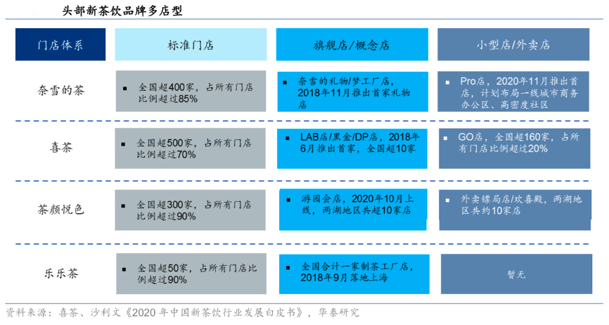 經典案例:根據喜茶、沙利文《2020年中國新茶飲行業發展白皮書》、華泰研究等綜合資訊表明,頭部新茶飲品牌基于主要消費人群,新式茶飲的裝修與設計重點考量了年輕 人群的需求,并針對不同消費場景,設計了不同類型的門店,包括標準店、主題店、快閃店、特色店等。差異化的店型,一方面能夠更好滿足消費者多元化的需求,另一方面也能夠兼容更多的物業場景,包括購物中心、寫字樓、居民區、交通中心等。