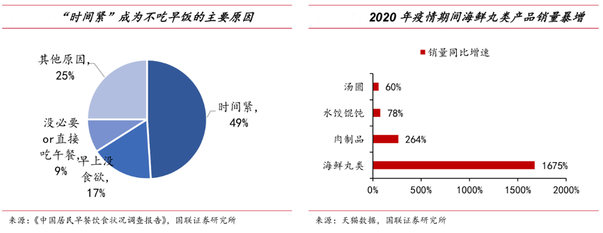 經典案例:根據《中國居民早餐飲食狀況調查報告》、天貓數據、國聯證券研究所等綜合資訊表明,由于外出行動限制,家庭用餐頻率高增,速凍食品銷售量大幅增加。根據天貓平臺統計數據顯示,2020年春節期間,速凍食品 銷售額普漲,其中海鮮丸類銷量同比增長 1675%,速凍肉制品也增長 264%。