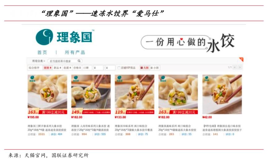 經典案例:根據天貓官網、國聯證券研究所等綜合資訊表明,冰激淋屆“愛馬仕”品牌“鐘薛高”也將喵頭對準了水餃領域,推出了高端水餃品牌“理象國”,以黑豬肉、松茸等高端食材原料為最大賣點,保質期短,平均價格 3 元/只,最高甚至達到 6 元/只的價格區間,依其品牌口碑與口味品質在速凍水餃領域占據了一席之地。
