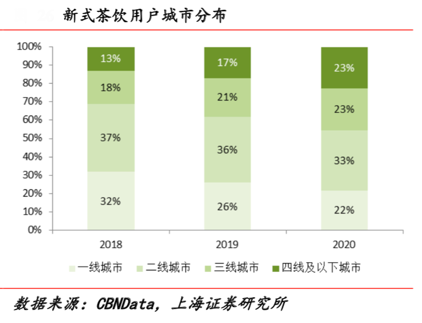 經典案例:根據CBNData、上海證券研究所等綜合資訊表明,從市場下沉來看,2020年新式茶飲在一線、二線、三線、四線及以下城市市場增速分別為 40.53%、52.24%、81.9%、124.7%,三線以下城市新式茶飲市場有很大的增長空間。
