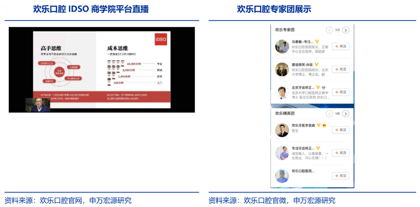 經典案例:根據歡樂口腔官網、歡樂口腔官微、申萬宏源研究等綜合資訊表明,以歡樂口腔為例,其為個體品牌牙醫提供 2B 服務, 包括投資、實體診所、醫院建設、證照辦理等系列服務,醫生合伙人可以在新診所持有 70% 的股權。公司致力于給自己打上“醫生創業”標簽,商業模式類似于“女團造星”,通過直播和培訓的方式輸出名醫IP,通過流量方式裂變口碑傳播路徑,加速品牌滲透。