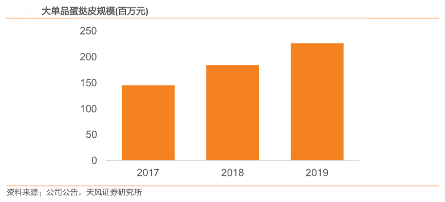 經典案例:根據公司公告、天風證券研究所等綜合資訊表明,“撻皮”是公司冷凍烘焙食品中規模領先、增長穩定的明星單品。2017-2019年公司撻皮收入分別為 1.45/1.84/2.26 億元,CAGR 達到24.8%,在冷凍烘焙食品中占比30%以上。公司較早切入 撻皮這類適合工業化生產的冷凍烘焙品類,采用大單品策略實現銷量增長。