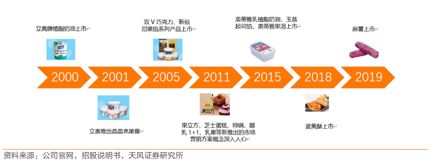 經典案例:根據公司官網、招股說明書、天風證券研究所等綜合資訊表明,立高依托于自身強勁研發實力,不斷推出新品,獲得了客戶的高度認可。2000年立高牌植脂奶油上市為立高在行業內占據一席之地,2001年立高推出晶晶亮果膏使得果膏蛋糕成為一個行業品類, 2018年、2019年公司又分別推出蛋黃酥和麻薯進一步擴寬了公司的業務。其以豐富的產品能充分滿足下游不同類型客戶的多產品、多規格的一站式采購消費需求,極大的提高了客戶的使用便利性。