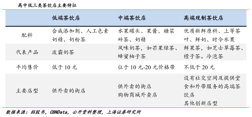 經(jīng)典案例:根據(jù)招股書、CBNData、公開資料整理、上海證券研究所等綜合資訊表明,近年來隨著對(duì)新式茶飲體驗(yàn)的需求不斷增長,顧客更愿意為提升消費(fèi)體驗(yàn)支付更多的費(fèi)用,因此涌現(xiàn)了大批高端的現(xiàn)制茶飲點(diǎn)店。以平均售價(jià)劃分,現(xiàn)制茶飲店可分為三類:高端店(平均售價(jià)不低于 20 元)、中端店(10元-20 元)、低端店(低于10元)。高端茶飲店以優(yōu)質(zhì)茶葉代替茶粉、以新鮮水果代替糖漿、以進(jìn)口奶油代替奶精,同時(shí)注重場景設(shè)置和門店的空間體驗(yàn),致力于為顧客提供一個(gè)集社交與休閑屬性于一體的場所。