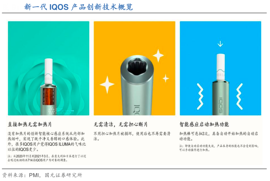 經典案例:根據PMI、國元證券研究所等綜合資訊表明,IQOS ILUMA作為PMI新一代無煙未來的“使命承載者”同時被譽為迄今為止最具創新的“革命性”產品,其采用了多項創新技術,其中最重要的是摒棄了傳統加熱薄片來加熱煙彈的方式,在新設備中使用了 SMARTCORE INDUCTION SYSTEM,使得可以在沒有加熱片的情況下實現內部加熱煙葉。同時由于新設備中不含加熱薄片,因此不會出現斷片的情況,也不需要像傳統 IQOS 產品一樣進行清潔。