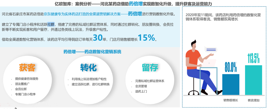 經典案例:根據億歐智庫《億歐智庫-醫藥行業:2021年中國藥店創新趨勢報告》等綜合資訊表明,藥店借助全渠道數智化營銷體系,通過會員管理、送藥上門、客戶社群運營、門店小程序、店員零售助手、分銷商城等,全方位提升客戶運營及獲客能力,全面提升藥店客流并最終推動銷售增長。