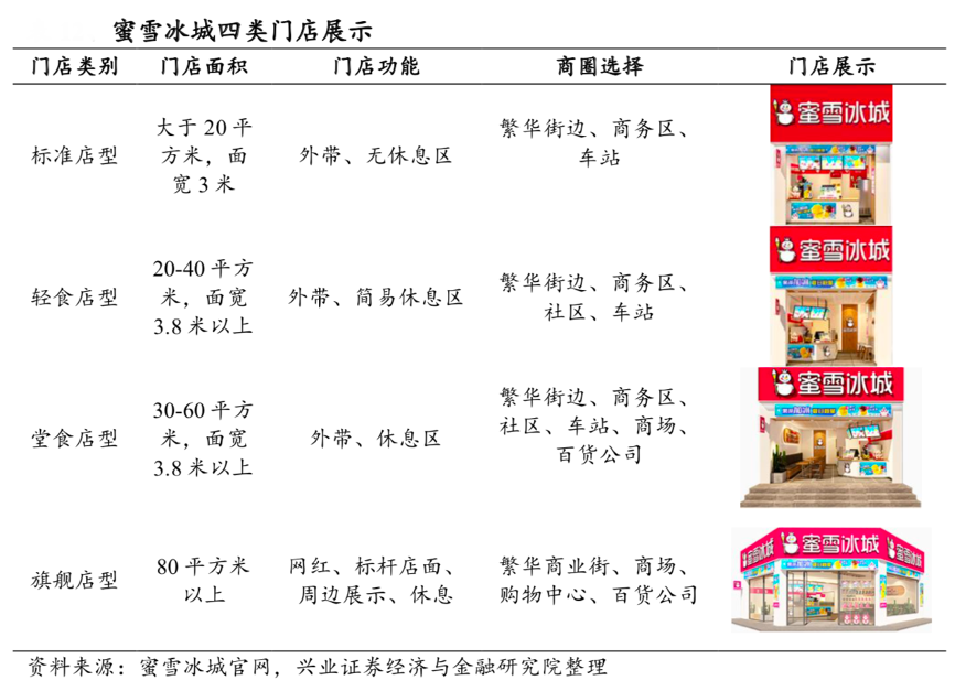 經(jīng)典案例:根據(jù)蜜雪冰城官網(wǎng)、興業(yè)證券經(jīng)濟(jì)與金融研究院等綜合資訊表明,蜜雪冰城推出四種店型,包括標(biāo)準(zhǔn)店型、輕食店型、堂食店型及旗艦店型,門店面積從 20 平方米以上到 80 平方米以上,功能從外帶、無休息區(qū)到網(wǎng)紅標(biāo)桿店、周邊展示,選址覆蓋街邊、商務(wù)區(qū)、車站、社區(qū)、商場(chǎng)、百貨公司和購(gòu)物中心,基本覆蓋多數(shù)的用戶消費(fèi)場(chǎng)景。
