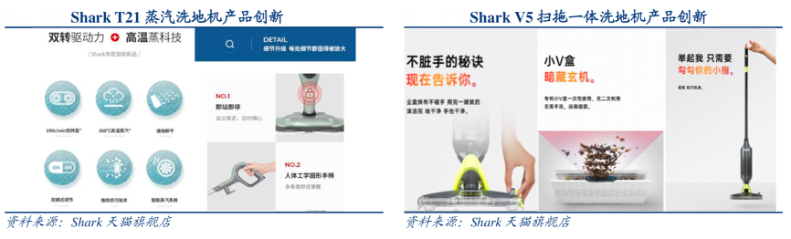 經典案例:根據Shark天貓旗艦店、華創證券等綜合資訊表明,2021年Shark協同九陽研發針對國內家庭拖地剛需推出 2 款洗地機新品:T21 蒸汽洗地機和 V5 吸拖一體洗地機。在聚焦國內本土用戶需求的同時繼續發揮 Shark 以用戶為中心的產品創新能力,T21具備實時調整蒸汽出量的智能蒸汽系統及按需切換的雙清潔模式;V5具備如“一鍵即拋”不臟手、機身輕巧單個手指即可提起、專利集塵小V盒提升清潔能力等產品創新。