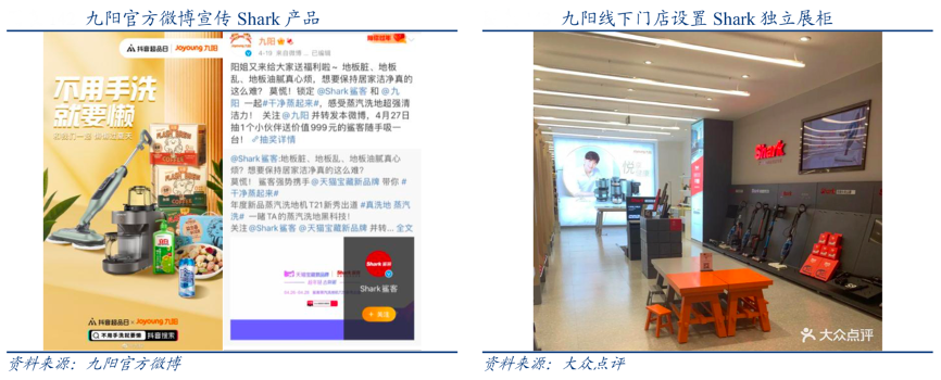 經典案例:根據九陽官方微博、大眾點評、華創證券等綜合資訊表明,Shark 國內渠道宣傳主要依托于九陽渠道基礎,線上利用九陽官方微博等平臺流量宣傳產品,線下 Shark 已經擁有獨立品牌門店 200 余家,定位高端Shopping Mall 及 KA 門店,2019年上半年開始利用九陽頭部門店設置 Shark 獨立展柜提高終端曝光度。