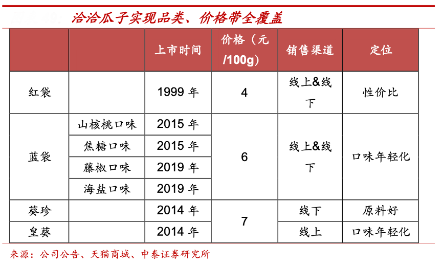 經(jīng)典案例:根據(jù)公司公告、天貓商城、中泰證券研究院等綜合資訊表明,洽洽瓜子實現(xiàn)了包裝瓜子品類、價格帶的全覆蓋。傳統(tǒng)紅袋 4 元/100g,主打線下渠道;藍(lán)袋、藤椒瓜子迎合年輕消費(fèi)者口味,均價 6 元/100g,覆蓋線上、線下渠道,成為洽洽瓜子品類新增長點;皇葵、葵珍系列瞄準(zhǔn)高端,強(qiáng)調(diào)品質(zhì),拉動瓜子品類毛利率 提升,均價約7元/100g,前者主打線上,后者覆蓋線下。