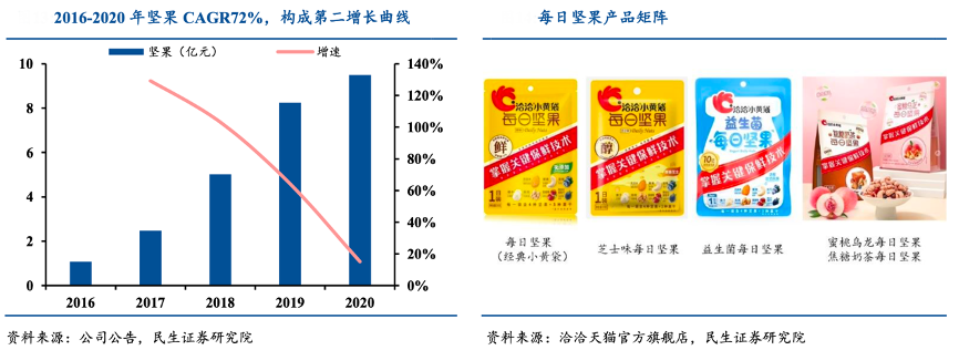 經(jīng)典案例:根據(jù)公司公告、洽洽天貓官方旗艦店、民生證券研究院等綜合資訊表明,洽洽沿著風(fēng)味化的路線持續(xù)探索,近期新推蜜桃烏龍味、焦糖奶茶味每日堅果,過去洽洽打造的每日堅果核心賣點為“掌握關(guān)鍵保鮮技術(shù)”,后期將轉(zhuǎn)變?yōu)?nbsp;“每日營養(yǎng)必需品”,更加契合健康營養(yǎng)化特征,也潛在拉高消費(fèi)者購買頻次。