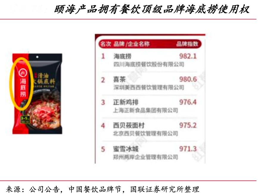 經(jīng)典案例:根據(jù)公司公告、中國餐飲品牌節(jié)、國聯(lián)證券研究所等綜合資訊表明,頤海國際在廣告營銷的投入低于天味。其更愿意通過更為扎實(shí)的產(chǎn)品來獲得用戶 的口碑,如同海底撈依靠無形服務(wù)帶動(dòng)用戶口碑傳播。另外,頤海由于主要產(chǎn)品使用 海底撈品牌,在廣告投放上可能與餐飲端海底撈產(chǎn)能影響,因此在廣告營銷投入意愿 較低。在火鍋底料業(yè)務(wù)上,頤海依靠海底撈的使用權(quán)擁有相 對(duì)較強(qiáng)的領(lǐng)先優(yōu)勢(shì)。根據(jù)中國餐飲品牌節(jié) 2019 年推出的餐飲品牌力榜單中,海底撈 奪得榜首。