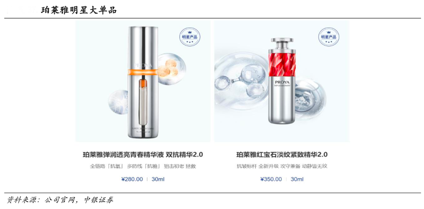 經(jīng)典案例:根據(jù)公司官網(wǎng)、中銀證券等綜合資訊表明,2019年珀萊雅品牌打造爆品黑海鹽泡泡面膜,主打深層清潔和保濕,并在天貓旗艦店月銷超 100 萬盒,破天貓美妝歷史;在獲得較高品牌關注度后,其緊接著于 2020 年推出復配抗老界兩大靈魂分子(1%超分子維A醇、20%的超高濃度六勝肽)的紅寶石精華和內含獨有核心抗初老成分的雙抗精華,迅速成為公司的兩大明星單品。
