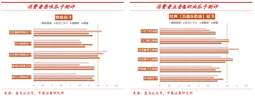 經典案例:根據盒馬公眾號、中泰證券研究所等綜合資訊表明,在綜合考慮包裝美觀度、香脆度、瓜子仁飽 滿度、美味程度的前提下,洽洽在原味瓜子、五香/奶油瓜子、南瓜子、西瓜子等品類上都具備明顯優勢。