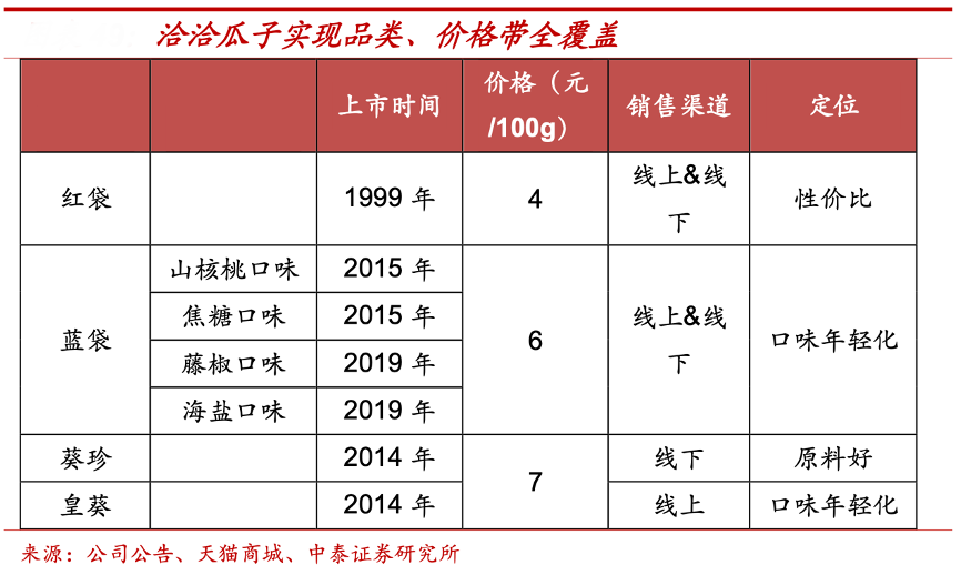 經典案例:根據公司公告、天貓商城、中泰證券研究所等綜合資訊表明,洽洽瓜子基本實現了包裝瓜子品類、價格帶的全覆蓋。傳統紅袋 4 元/100g,主打線下渠道;藍袋、藤椒瓜子迎合年輕消費者口味,均價 6 元/100g,覆蓋線上、線下渠道,成為洽洽瓜子品類新增長點;皇葵、葵珍系列瞄準高端,強調品質,拉動瓜子品類毛利率提升,均價約 7 元/100g,前者主打線上,后者覆蓋線下。