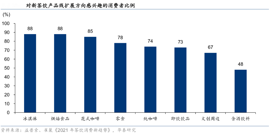 經(jīng)典案例:根據(jù)益普索雀巢《2021年茶飲消費新趨勢》、華泰研究等綜合資訊表明,新茶飲領(lǐng)先品牌產(chǎn)品類別已拓展至茶飲外的品類,包括冰淇淋、烘焙食品、花式 咖啡、零售、即飲飲品等其,甚至拓展到文創(chuàng)周邊等非餐飲品類。這不但可擴展品牌的消費時間與場景,還可為消費者提供更多維度的體驗。據(jù)益普索、雀巢聯(lián)合發(fā)布的《2021 年 茶飲消費新趨勢》,分別有 88%、88%、85%的消費者對新茶飲品牌推出的冰淇淋、烘焙食品、花式咖啡感興趣。