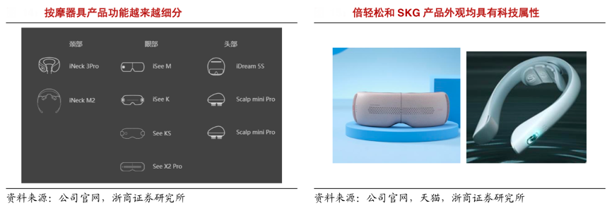經典方法:根據公司官網、天貓、浙商證券研究所等綜合資訊表明,從消費場景來看,按摩器具消費者很多需要在辦公場合或商旅場景中使用,而便攜和輕量化則很大程度上適應這種功能趨勢,倍輕松推出的頭皮和頸部按摩器均為小體積產品,skg 的熱銷產品頸椎按摩器也體型較小,可以隨身攜帶。購買產品的商旅人士和年輕消費群體對外觀的注重程度更大,更富科技感的外觀可以為產品添加更多高端屬性。