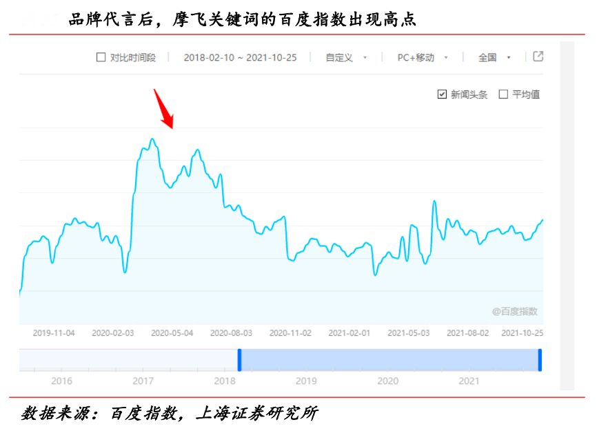 經典案例:根據百度指數、上海證券研究所等綜合資訊表明,2021年4月新寶公司宣布王俊凱成為其形象代言人,消息一出摩飛的熱度升至一個高點。這次代言除了幫 助品牌提升曝光度外,也從深層次幫品牌塑造潮流、優雅的品牌形 象,讓品牌理念更加形象化和風格化,有利于品牌長期的競爭力。