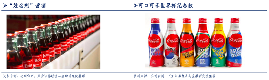 經典案例:根據Bing圖庫、公司官網、興業證券經濟與金融研究院等綜合資訊表明,為了吸引年輕人關注,2011年,可口可樂在澳洲首次推出“姓名瓶”,可口可樂公司收錄了800余個年齡段在13-34歲間的常見英文名。可口可樂在瓶身之上還打造著更多的創意營銷。在姓名瓶之后,可口可樂又推出歌詞瓶、臺詞瓶等新瓶身,選取經典歌詞、臺詞印制, 甚至在電影院等場所還設有機器,使消費者可以定制臺詞瓶。