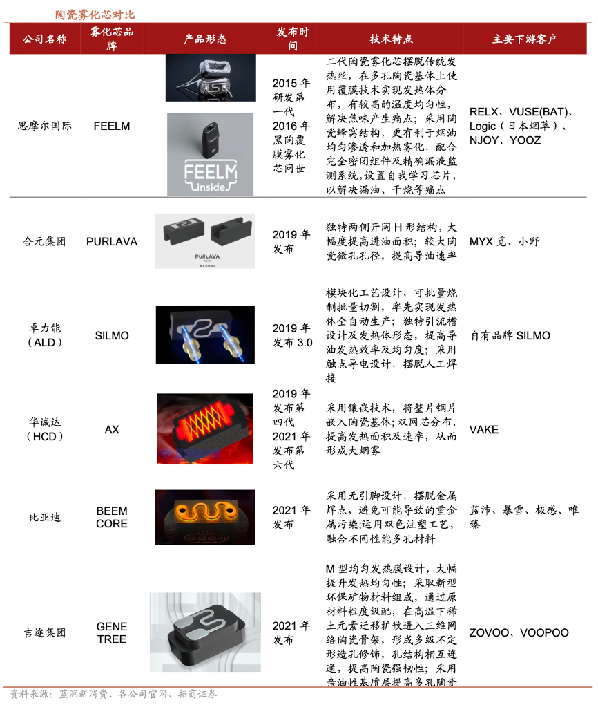經典案例:根據藍洞新消費、各公司官網、招商證券等綜合資訊表明,面臨專利壁壘繞行困境,思摩爾國際通過技術先發優勢,率先通過含有陶瓷加熱技術產品與頭部品牌合作開拓市場,形成了陶瓷霧化芯領域品牌效應。其次,通過與頭部電子煙品牌合作,使得“FEELM inside”霧化芯技術品牌標識得以塑造,成為電子煙消費者心目中的心智霧化芯品牌,通過電子煙品牌綁定實現霧化芯技術品牌溢價。