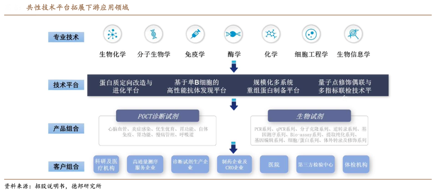 經典案例:根據招股說明書、德邦研究所等綜合資訊表明,諾唯贊公司基于其獨立的技術平臺,拓展了廣泛的下游應用領域。1)其推出包含 PCR 系列、qPCR 系列、分子克隆系列、逆轉錄系列等多個系列的生物試劑以及 包含心腦血管、炎癥感染、優生優育、胃功能等 8 個系列的 POCT 診斷試劑;2)形成了多重客戶群體組合:科研院校、高通量測序服務企業、分子診斷試劑生產 企業、制藥企業、CRO 企業、醫院等醫療機構。