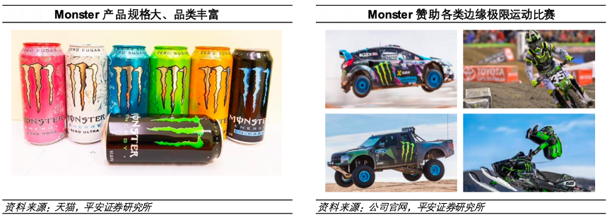 經(jīng)典案例:根據(jù)天貓、公司官網(wǎng)、平安證券研究所等綜合資訊表明,Monster 憑借差異化競爭策略實(shí)現(xiàn)后發(fā)制勝。其圍繞年輕消費(fèi)群體精準(zhǔn)營銷。Monster 主要贊助邊緣極限運(yùn)動(dòng)如越野摩托車賽、一級方程式賽車、格斗等賽事,成本相對較低,并且相對傳統(tǒng)運(yùn)動(dòng)項(xiàng)目更能向消費(fèi)者傳遞出年輕、狂野不羈的個(gè)性態(tài)度,與紅牛重視內(nèi)容輸出,其偏好贊助頂級賽事和親自策劃如街舞比賽、帆船比賽等營銷方式形成區(qū)別,同時(shí) Monster 也尤其注重地推,實(shí)現(xiàn)精準(zhǔn)營銷。