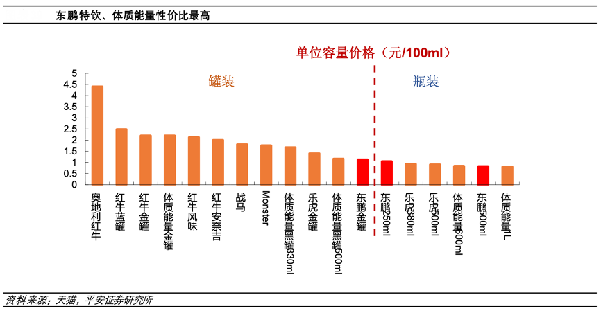 經(jīng)典案例:根據(jù)天貓、平安證券研究所等綜合資訊表明,東鵬特飲、體質(zhì)能量性價(jià)比和便攜性較好。1)性價(jià)比方面:目前國內(nèi) 4 款紅牛產(chǎn)品鎖定行業(yè)定價(jià)天花板,250ml 金罐終端價(jià)在 5-6 元,奧地利紅牛250ml 藍(lán)罐定價(jià)高達(dá) 11 元。第二梯隊(duì)中,戰(zhàn)馬、Monster 定價(jià)對標(biāo)紅牛,東鵬特飲和體質(zhì)能量性價(jià)比較高,其中東鵬產(chǎn)品全面涵蓋 2-5 元價(jià)格帶。2)包裝規(guī)格方面:配合高性價(jià)比策略,東鵬、體質(zhì)能量和樂虎等品牌均推出大規(guī)格 PET瓶裝,提升消費(fèi)者便攜性的同時(shí)降低成本,并且東鵬還擁有防塵蓋專利設(shè)計(jì),增強(qiáng)衛(wèi)生屬性及外觀辨識度;而紅牛包裝規(guī)格僅有 250ml 金罐和藍(lán)罐。
